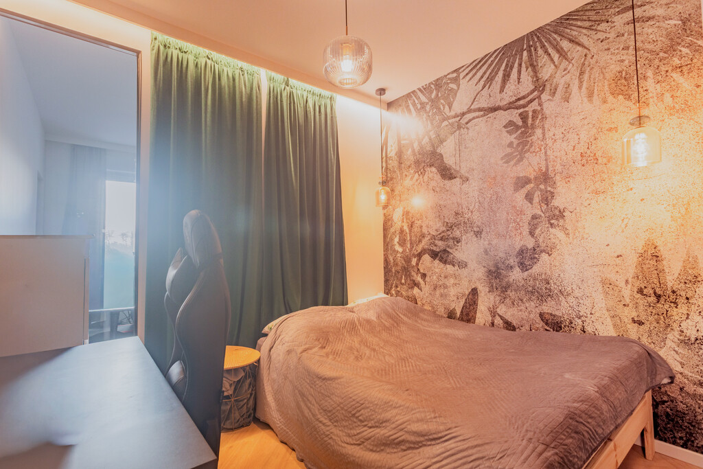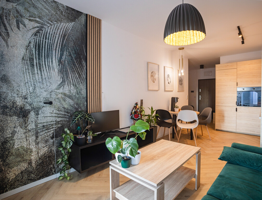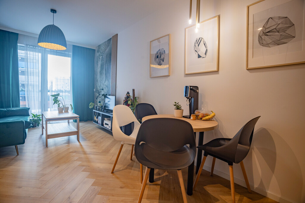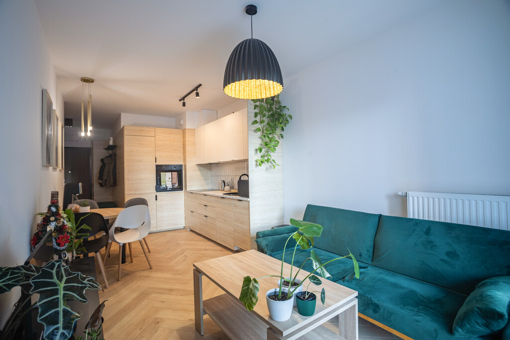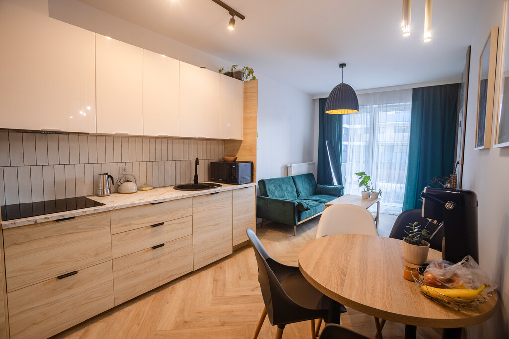 • Mieszkanie jest w pełni umeblowane i wyposażone (w tym meble, tekstylia, AGD w zabudowie i pralka).