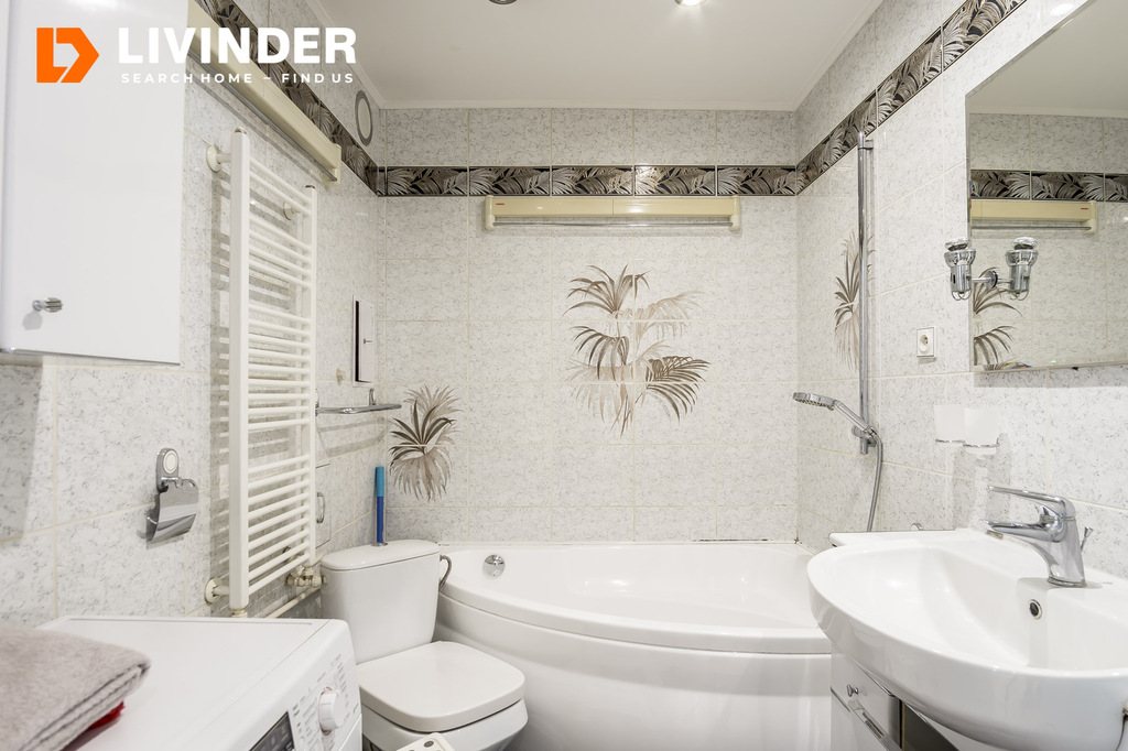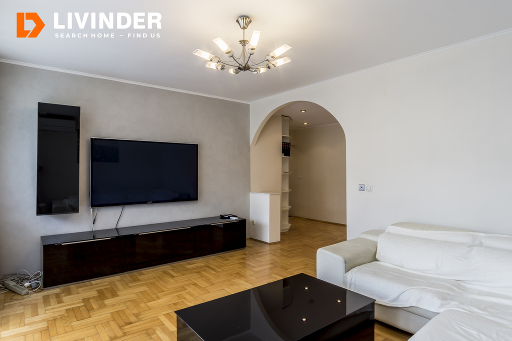 Całość wyposażenia widoczna na zdjęciach zostaje w mieszkaniu, łącznie z dużym TV oraz meblami w salonie.