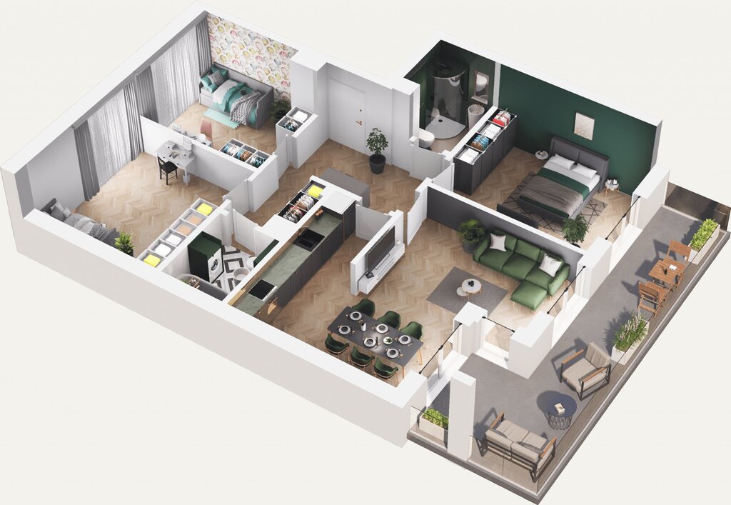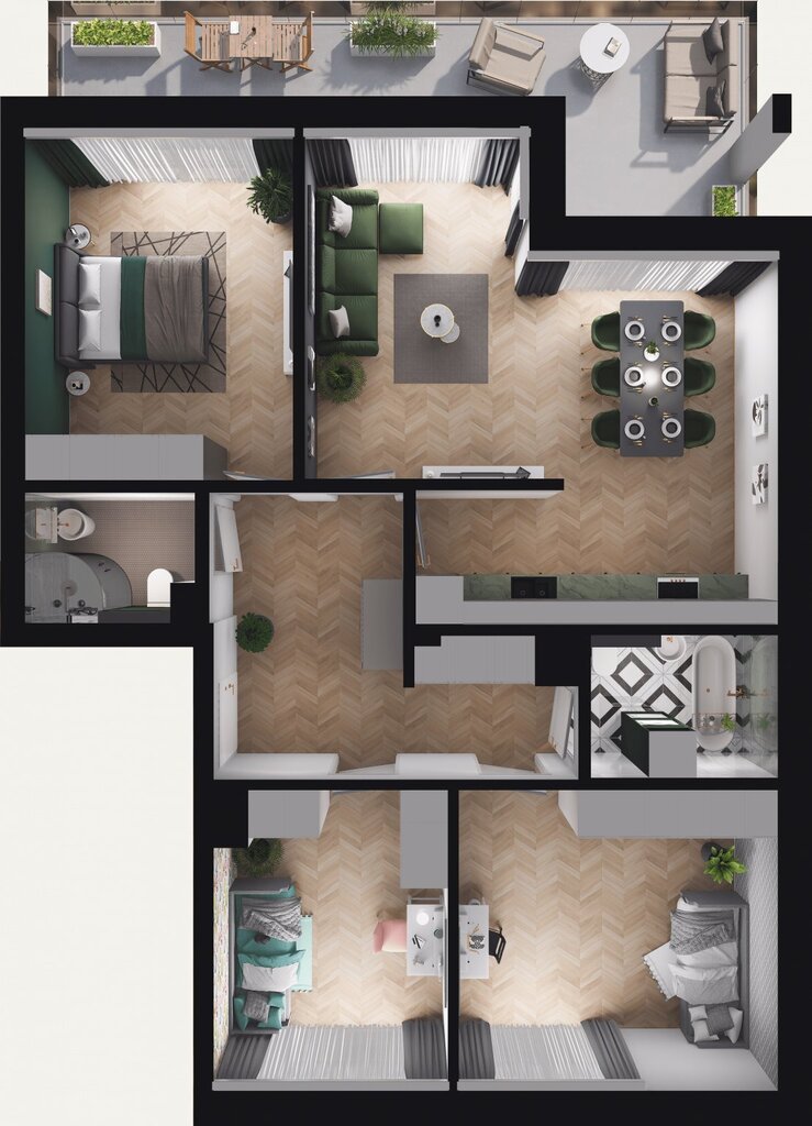 * Funkcjonalny układ: przestronny pokój dzienny z aneksem, 3 sypialnie, 2 łazienki — idealne do wygodnego życia rodzinnego lub home office