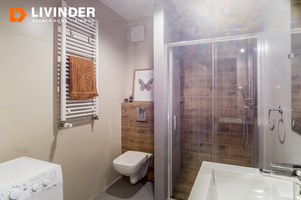 * łazienka: duża kabina prysznicowa, nowa szafka z umywalką, pralka,