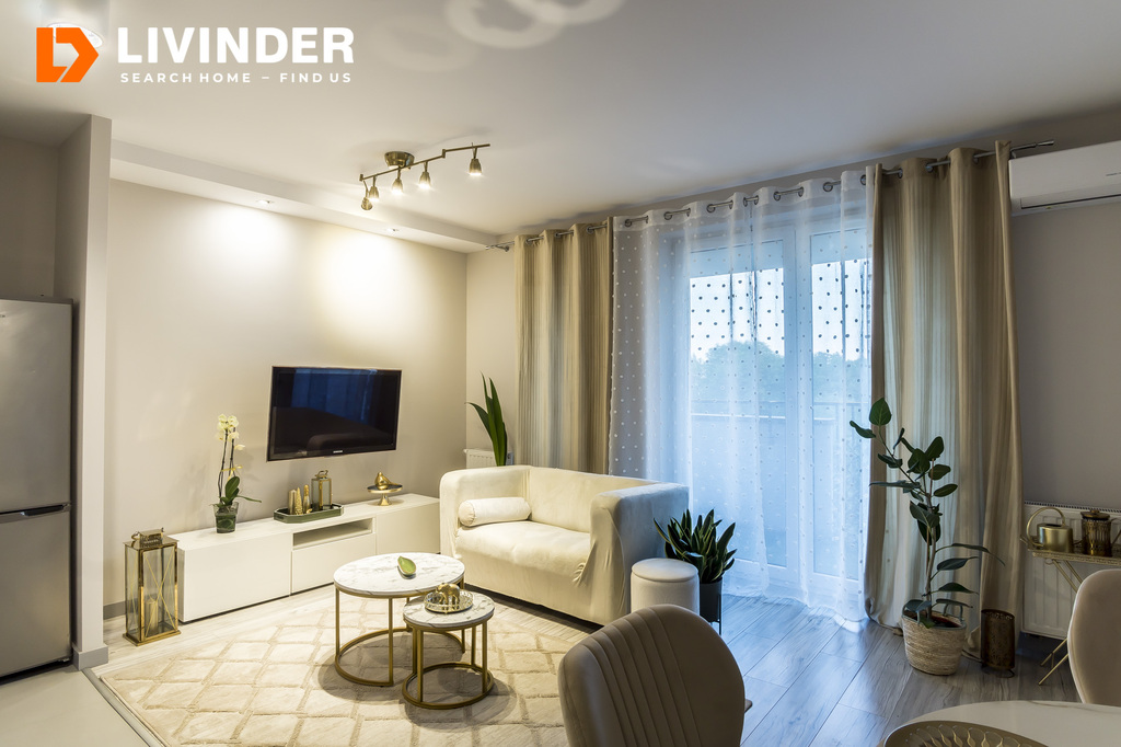 * salon: nowy, okrągły stół, trzy aksamitne krzesła, sofa dwuosobowa, stoliki kawowe, szafka RTV, klimatyzacja