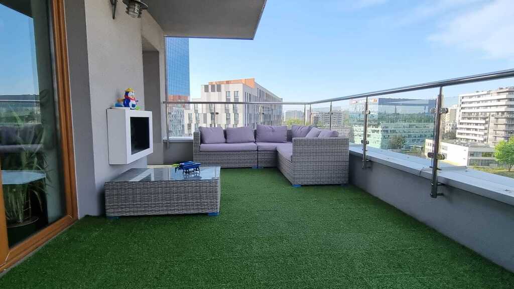 - Taras z kominkiem balkonowym, przyłączem wody oraz zgodą administracji na montaż jacuzzi