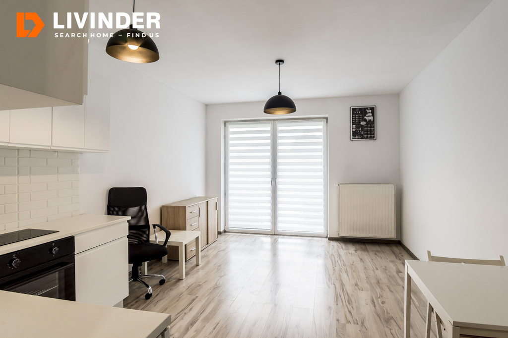 - Salon z aneksem kuchennym oraz wyjściem na balkon