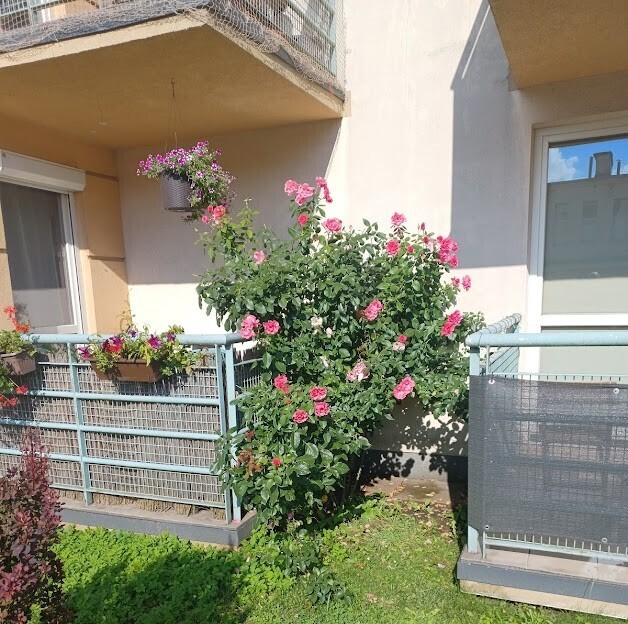 Balkon oferuje prywatność dzięki rosnącej pomiędzy nim a balkonem sąsiadującym róży fontannowej o wysokości ok. 1,5 metra, która przez cały sezon cieszy kwiatami i zapewnia naturalną osłonę przed słońcem.
