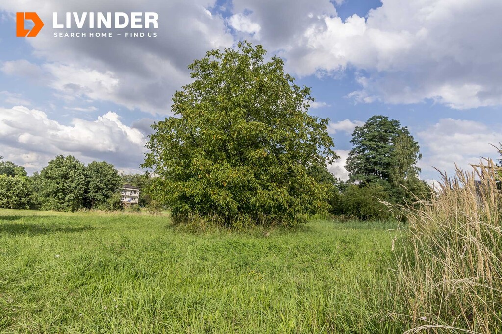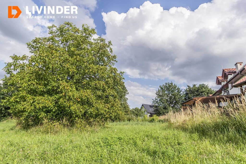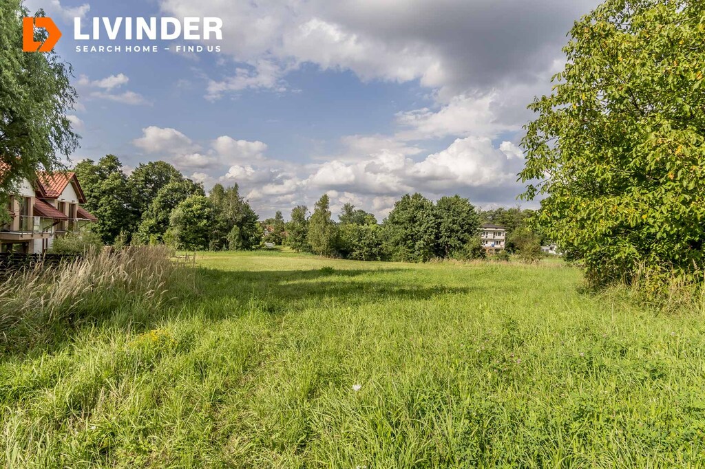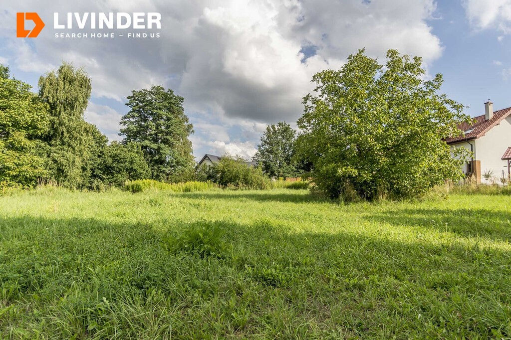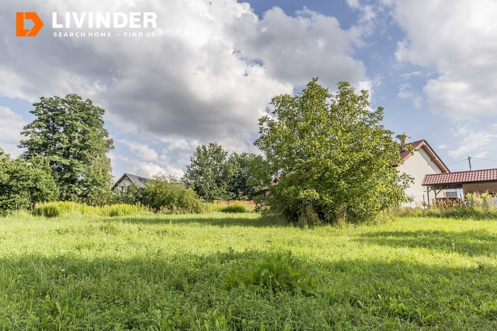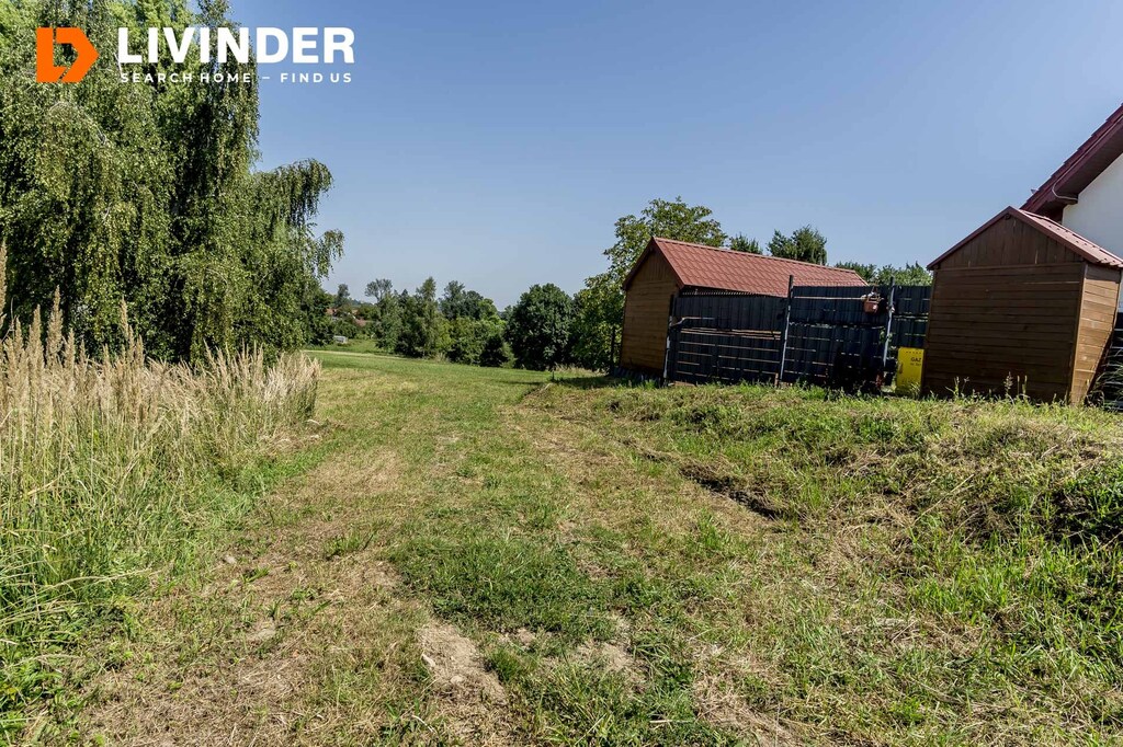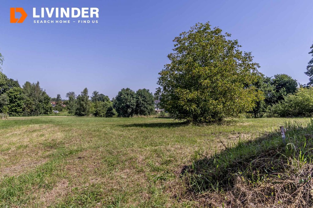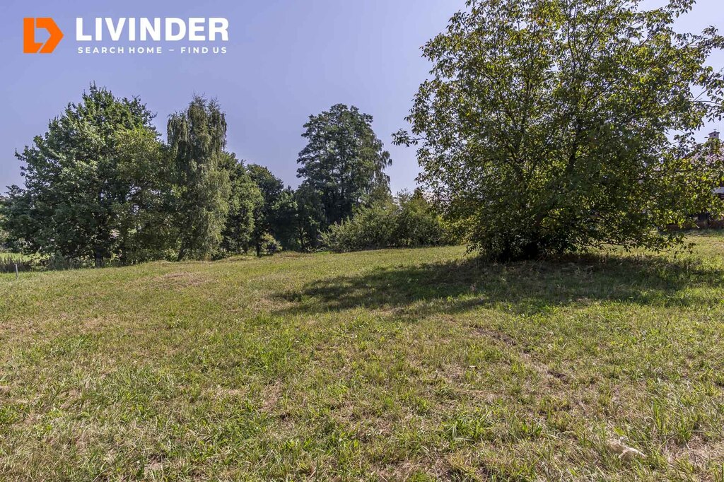 Działka częściowo budowlana ( 7,7 ar), pozostała część to łąki, jest w kształcie trapezu o szer. ok. 31 m2 i długości ok. 38 m2, posiada księgę wieczystą.