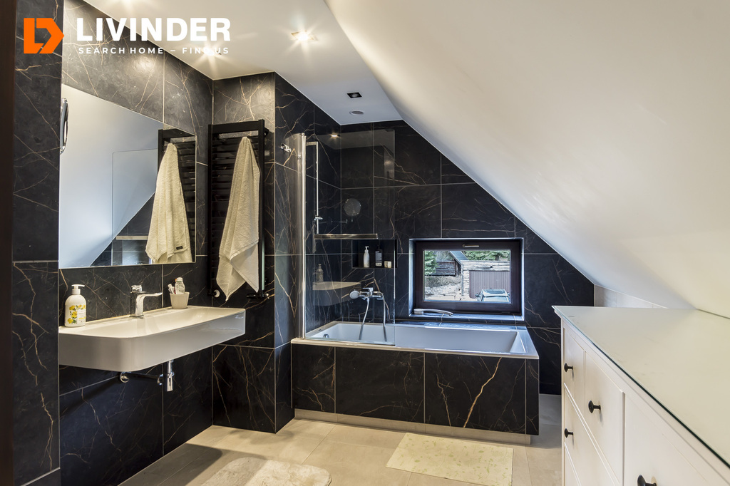 - Duża łazienka z oknem i wanną z parawanem i prysznicem.