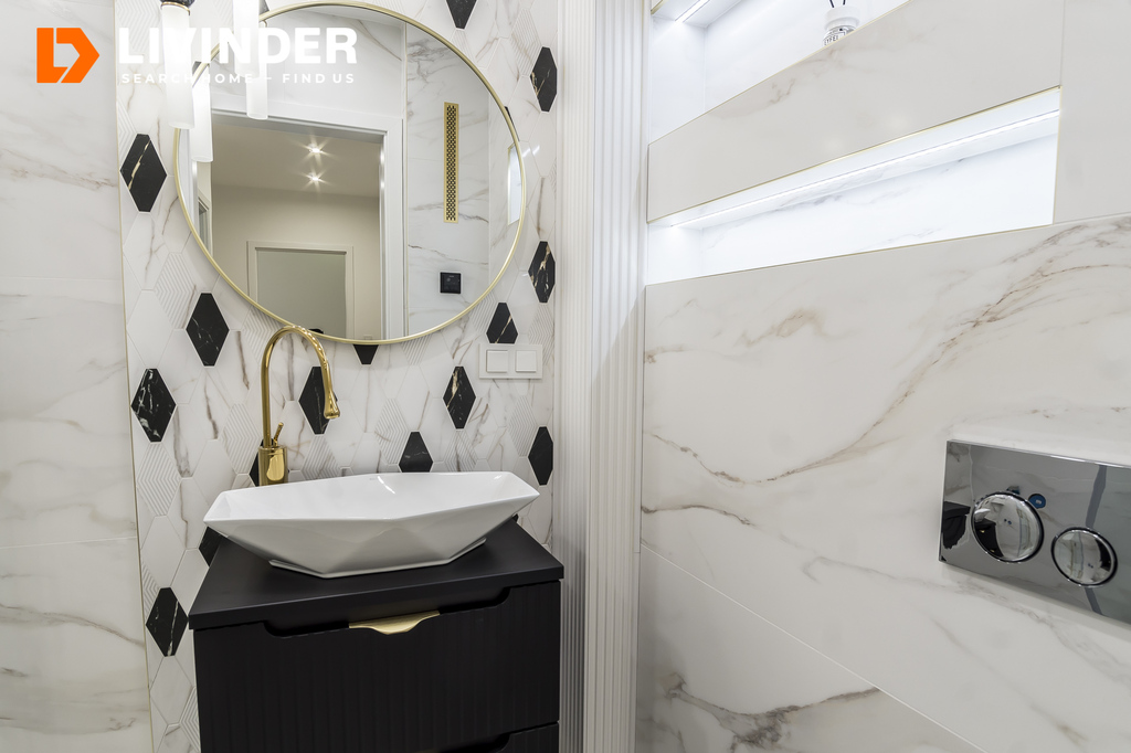 – nowoczesna łazienka z kabiną prysznicową , szafką z umywalką nablatową i nową armaturą.
