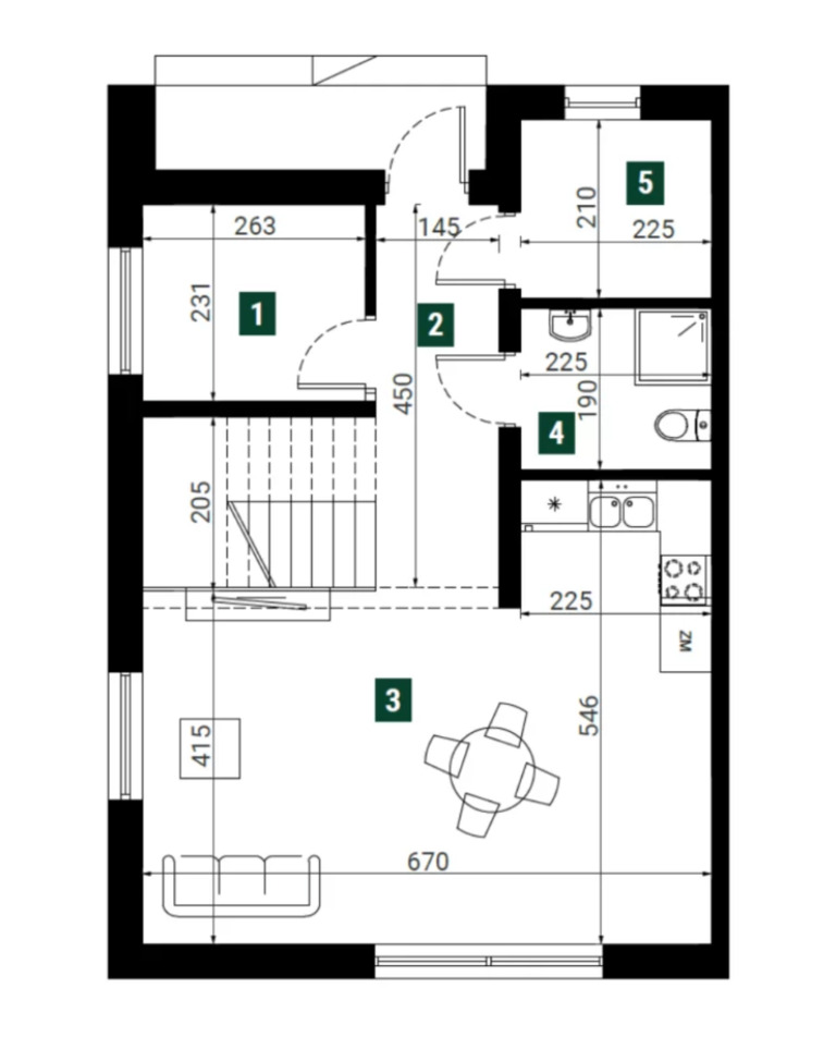 Salon z jadalnią i kuchnią (30,92m2), łazienka (4,28m2), kotłownia (4,73m2), pom. gospodarcze (6,08m2), komunikacja (9,28m2).