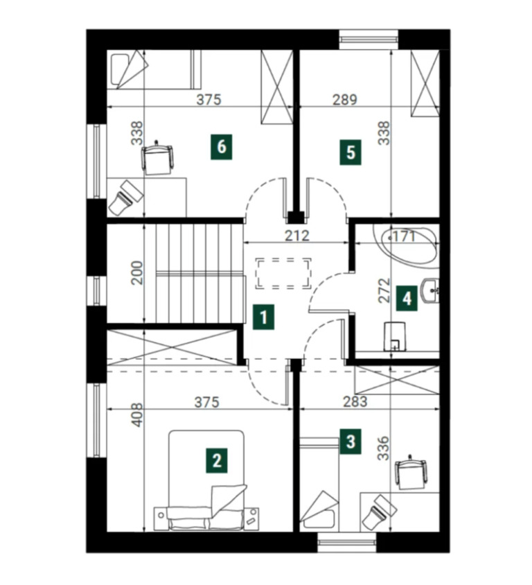 Sypialnia (14,49m2), pokój (9,57m2), pokój (12,68m2), łazienka (4,65m2), pom. gospodarcze (9,57m2), komunikacja (8,52m2).
