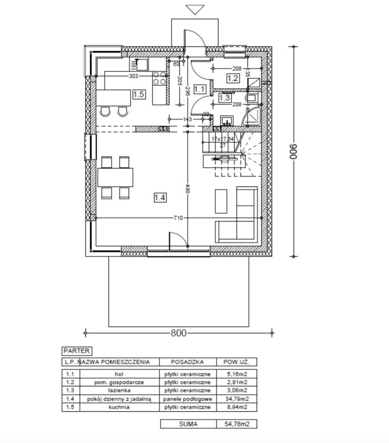 Salon z jadalnią, otwarta kuchnia, łazienka, pom. gospodarcze oraz hol.