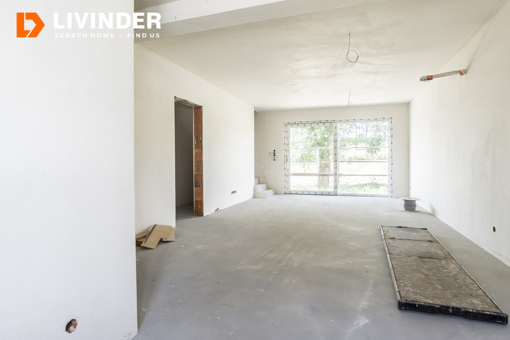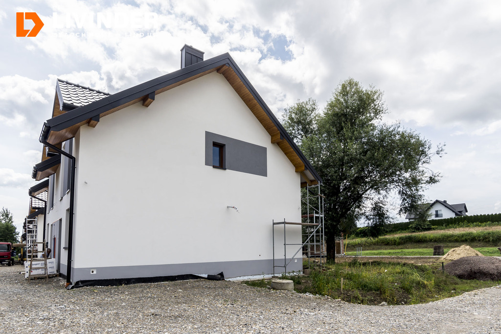 Wybudowany w 2024 roku (pustak porotherm, styropian 20 cm, dachówka), ostatnie prace wykończeniowe na zewnątrz planowane są do IX 2025 roku (ogrodzenie ogrodu, kostka brukowa, opaska wokół budynku).