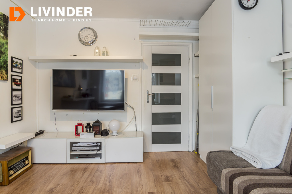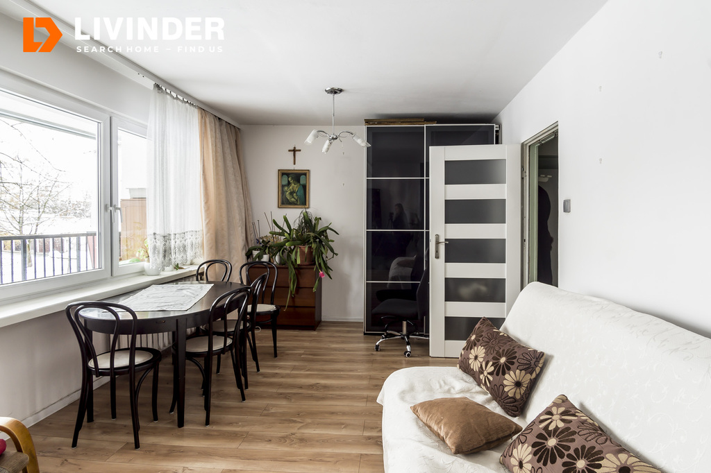 • Przestronny salon z balkonem – komfortowa strefa wypoczynku z widokiem na okolicę. W salonie: duża szafa przesuwna z Ikea, stół z krzesłami, komoda pod TV oraz wersalka.