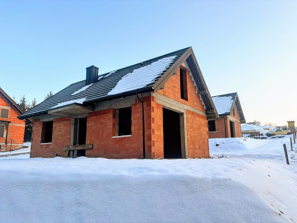 Stan surowy otwarty obejmuje konstrukcję budynku z dachem, oknami dachowymi i kominami.