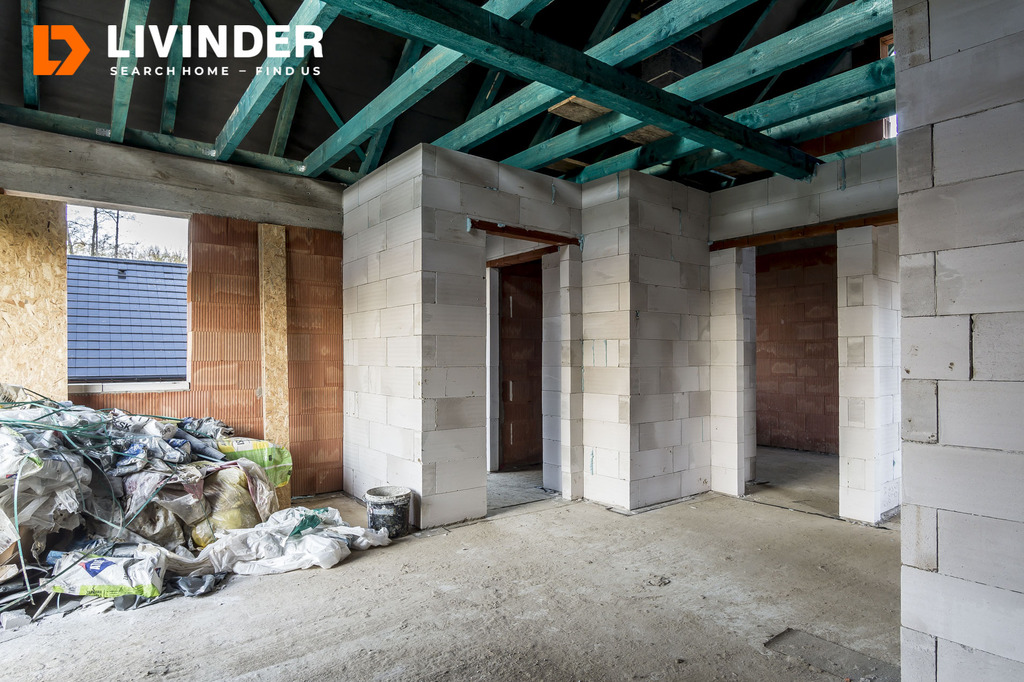 Stan surowy otwarty obejmuje konstrukcję budynku z dachem, oknami dachowymi i kominami.
